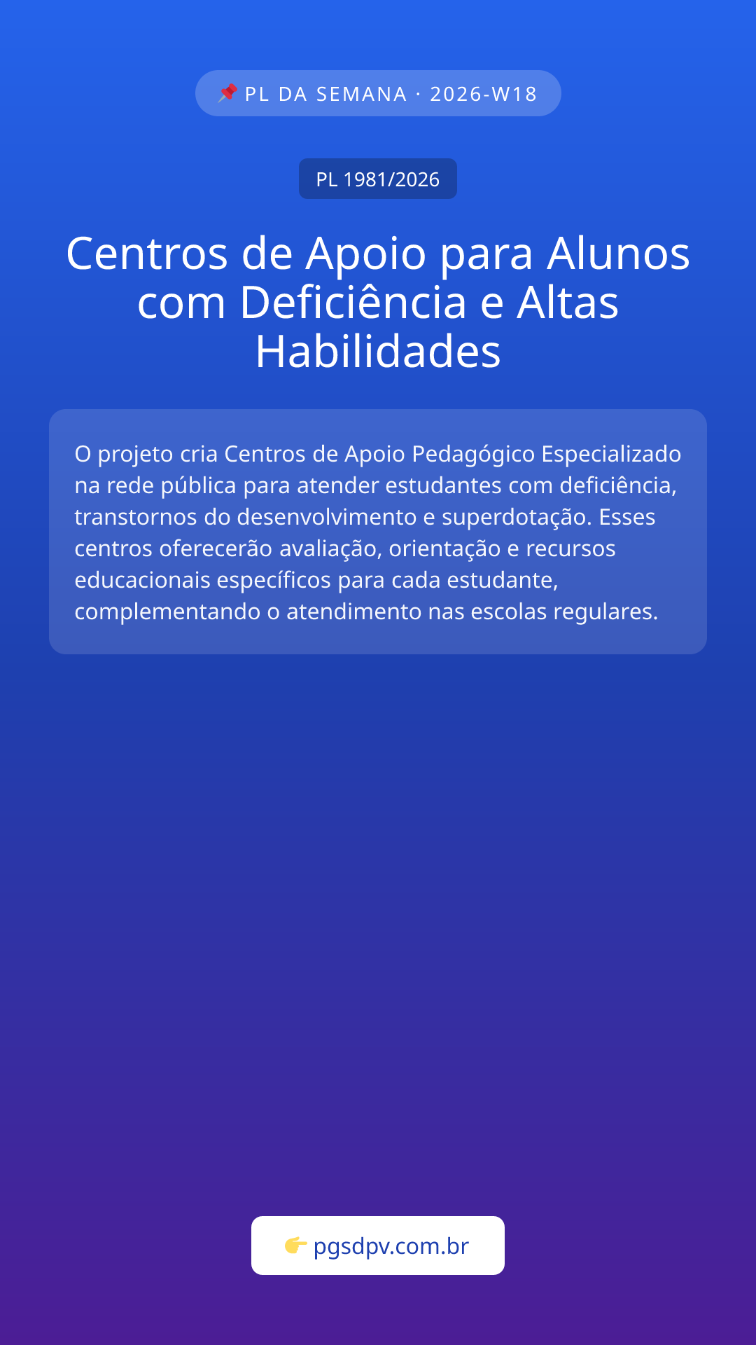 O projeto cria Centros de Apoio Pedagógico Especializado na rede pública para atender estudantes com deficiência, transtornos do desenvolvimento e superdotação. Esses centros oferecerão avaliação, orientação e recursos educacionais específicos para cada estudante, complementando o atendimento nas escolas regulares.